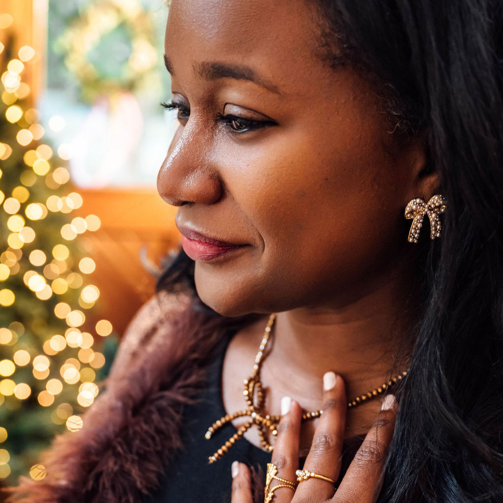 The Pearl Package Studs feature sculpted gold bows adorned with inset pearls, like a beautifully wrapped present waiting to be opened. Elegant and easy to wear, these studs bring just the right amount of holiday charm to everyday moments.