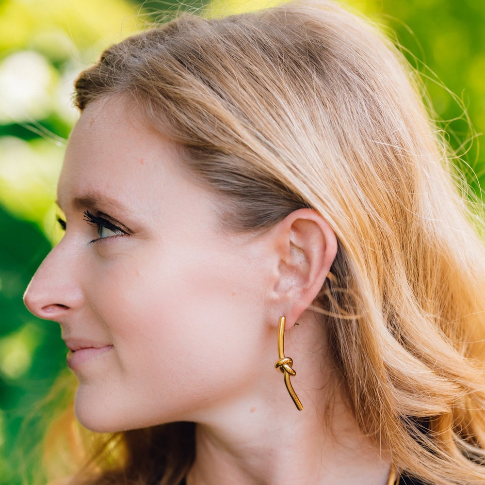 The Lauren Earrings are modern with a classic feel. These 2 inch post earrings are made from 14kt gold plated stainless steel with a knotted detail. Pair the earrings with the Lauren Cuff for a complete look.