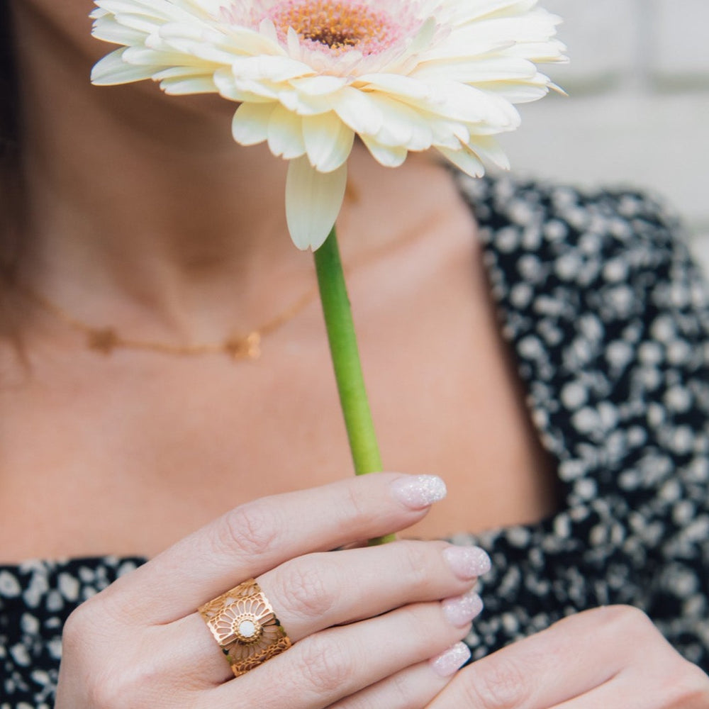 This adjustable ring will give you all this spring feels. With an Mother of Pearl stone center and intricate daisy detail, this ring is a must have for spring time.