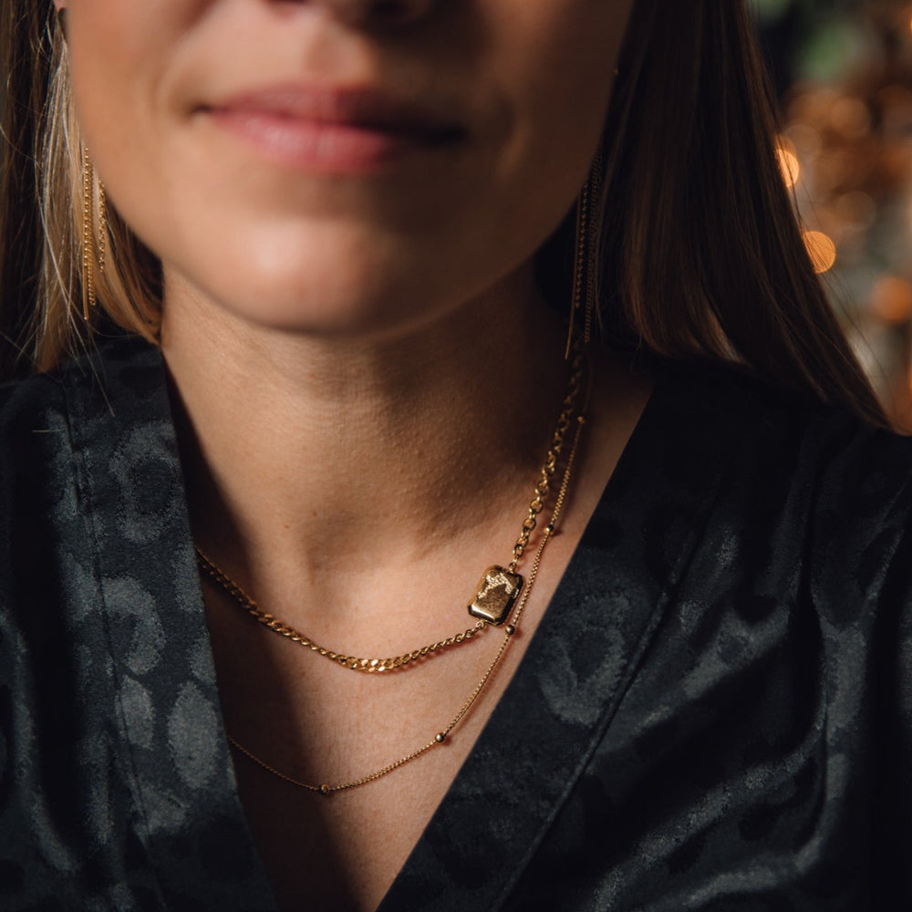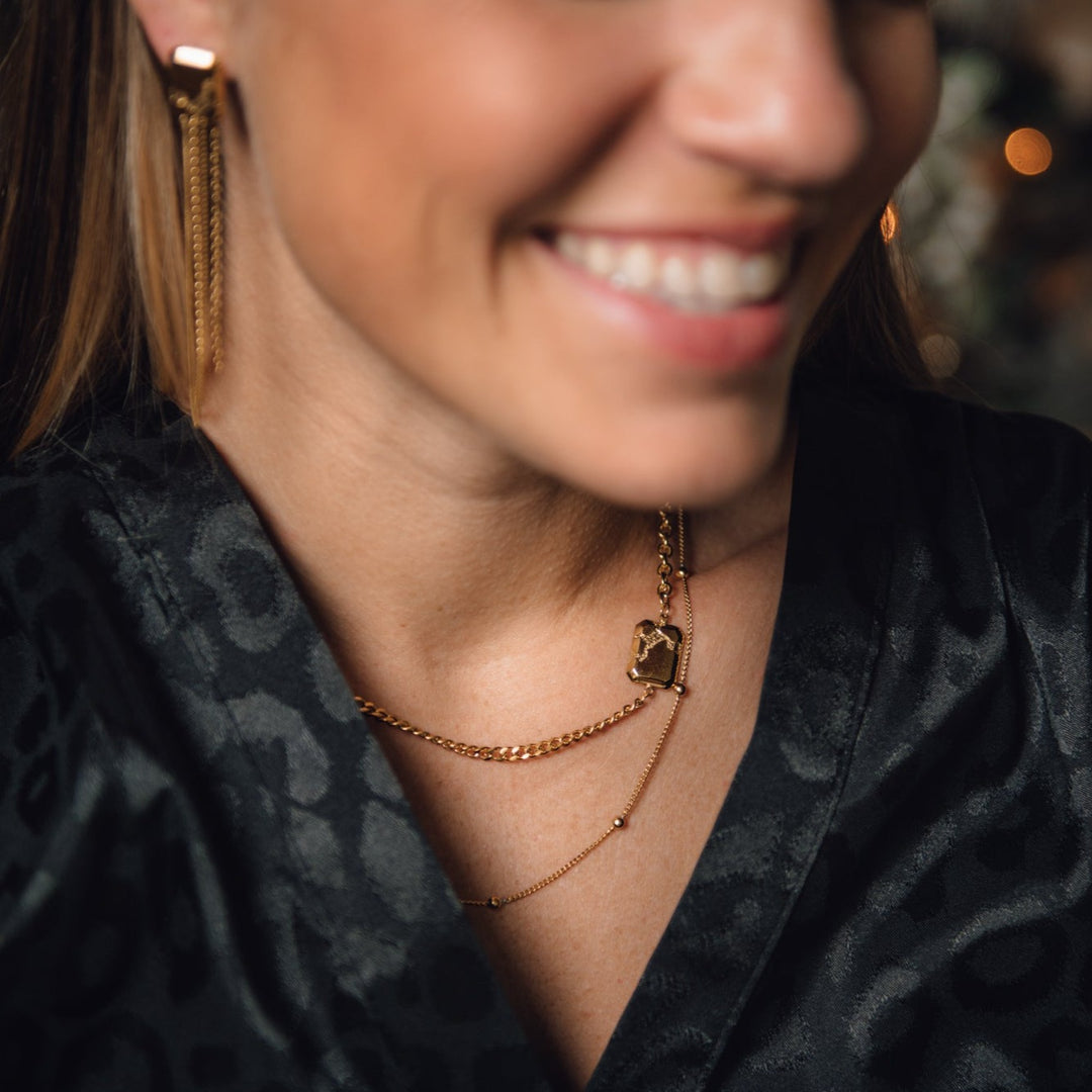 Layering is made easy with this necklace. Double layered chains with a geode carved pendant will look perfect with the Everett Tassel Earrings. Named after a future child and the love that could be one day.