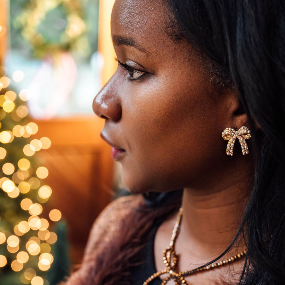 The Pearl Package Studs feature sculpted gold bows adorned with inset pearls, like a beautifully wrapped present waiting to be opened. Elegant and easy to wear, these studs bring just the right amount of holiday charm to everyday moments.