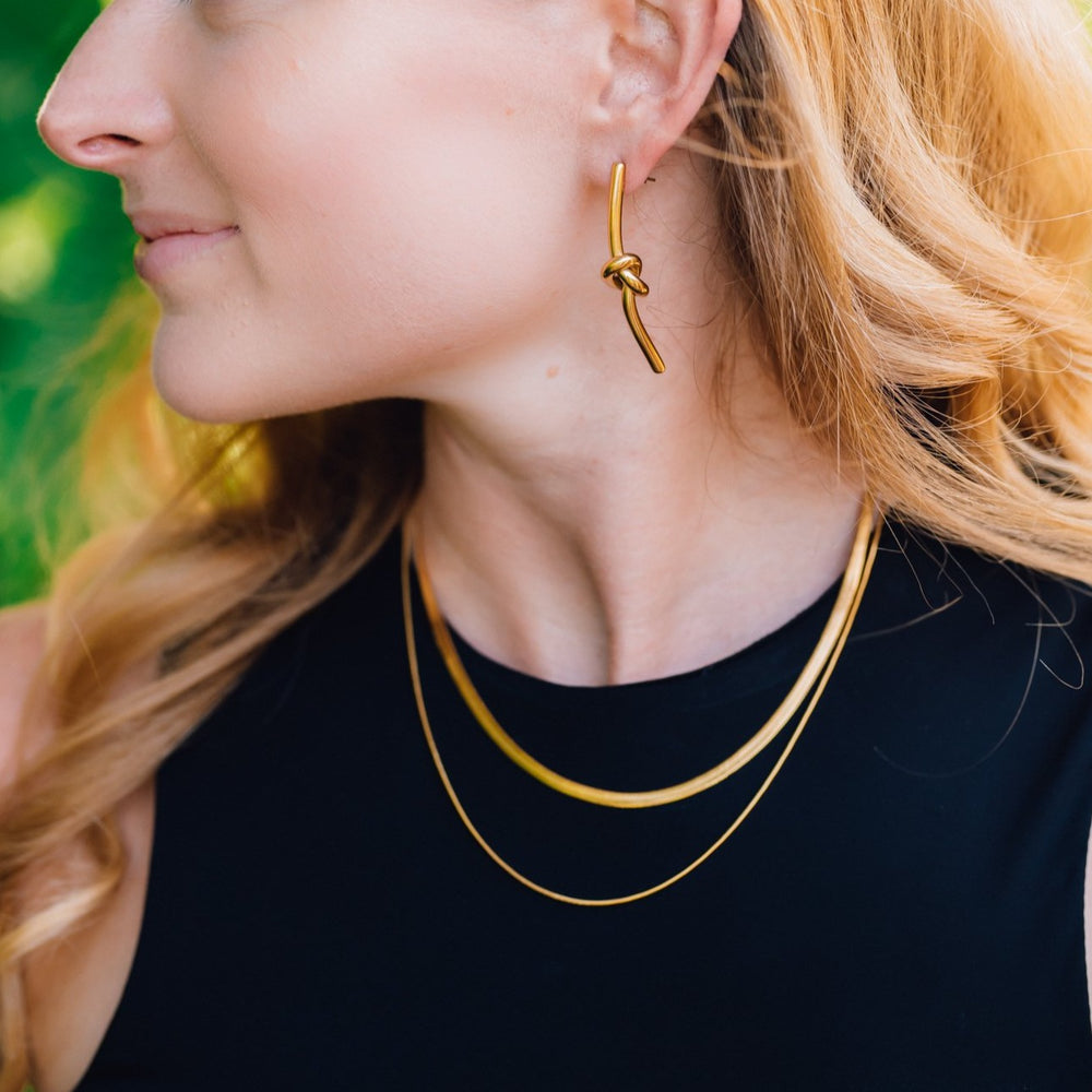 Layering is made easy with this necklace. The Robbie necklace features a flat snake chain and an additional dainty chain. Made from 18kt gold platted stainless steel, the necklaces is going to be your new favorite everyday accessory. Named after a sweet aunt.