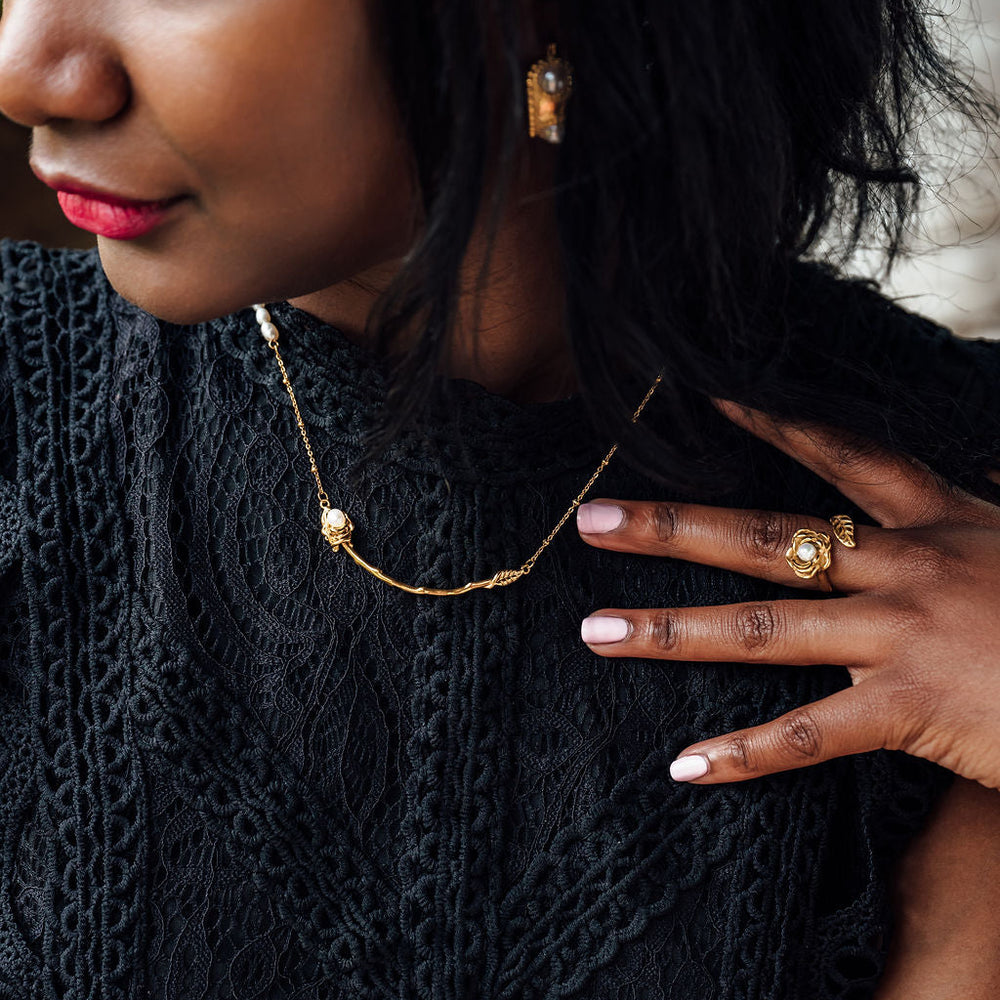 The Rose Necklace is a symbol of beauty, love, and grace. Crafted from gold-plated stainless steel, this piece features an intricately designed rose motif, accented with a pearl detail for an added touch of elegance.