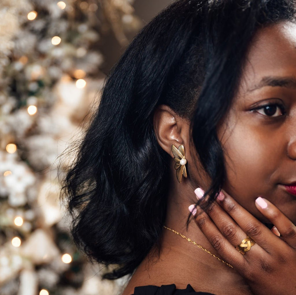 Introducing the Jules Earrings, a standout piece from our "Name the Jewelry Contest," inspired by a loving father whose name lives on through generations. These oversized studs are crafted from gold-plated stainless steel, featuring a stunning winged design adorned with a beautiful pearl detail. Designed to be more than just an accessory, the Jules Earrings embody the essence of wearable artwork, reflecting the creativity of Jules' daughter, an artist who used her father's name as an alias. With their unique shape and elegant finish, these earrings not only celebrate family legacy but also make a bold statement for any occasion. Embrace your individuality and carry a piece of this heartfelt story with you wherever you go.