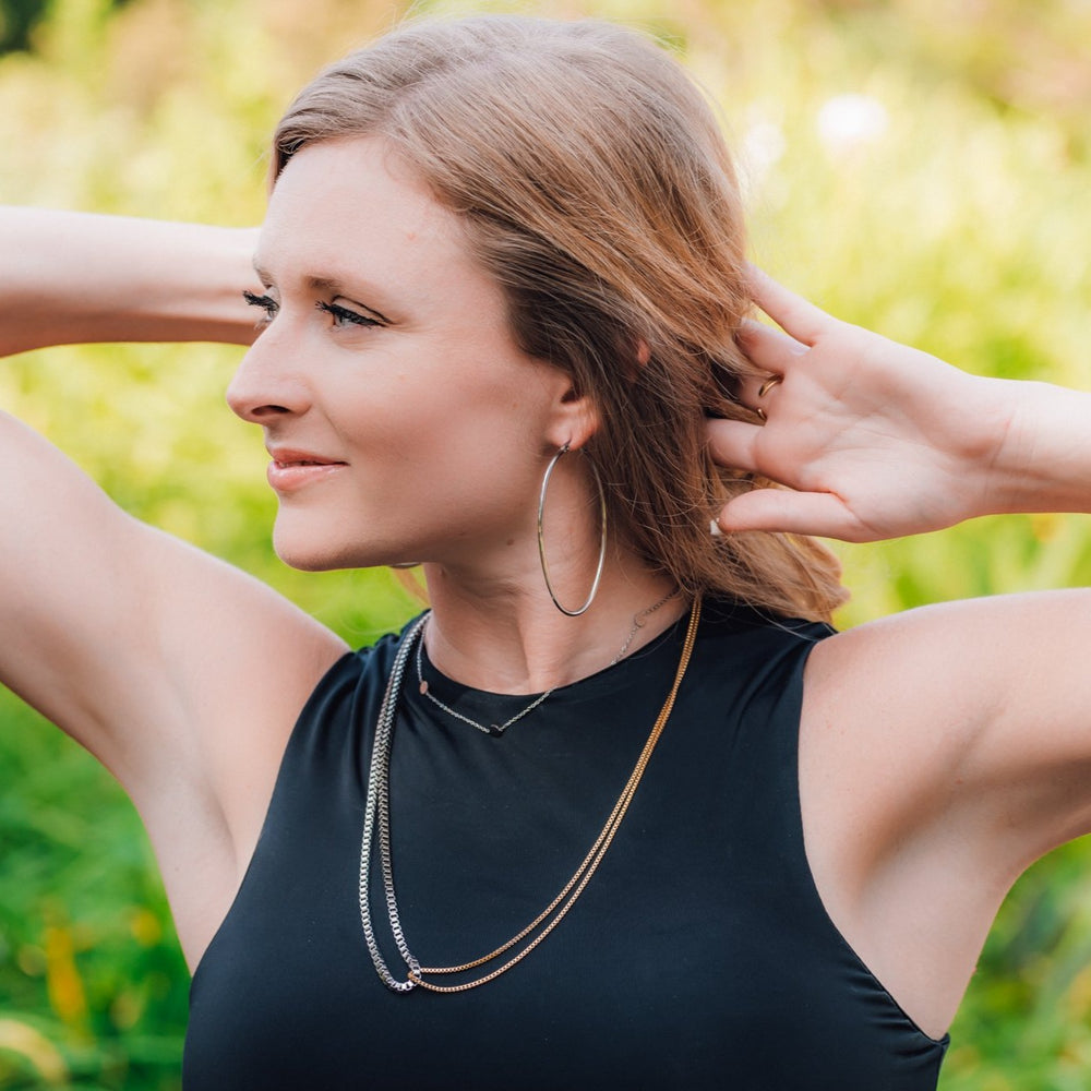 These thin oval gold hoops are as classic as they come! Not too big and not too small, Perfect for anyone who loves a simple hoop for everyday wear. The Classic Raven Earrings are 18kt Gold Plated Stainless Steel. A homage to one of our beautiful models who embodies the spirit of Steward & James. these earrings celebrated her poise, confidence and timeless allure.