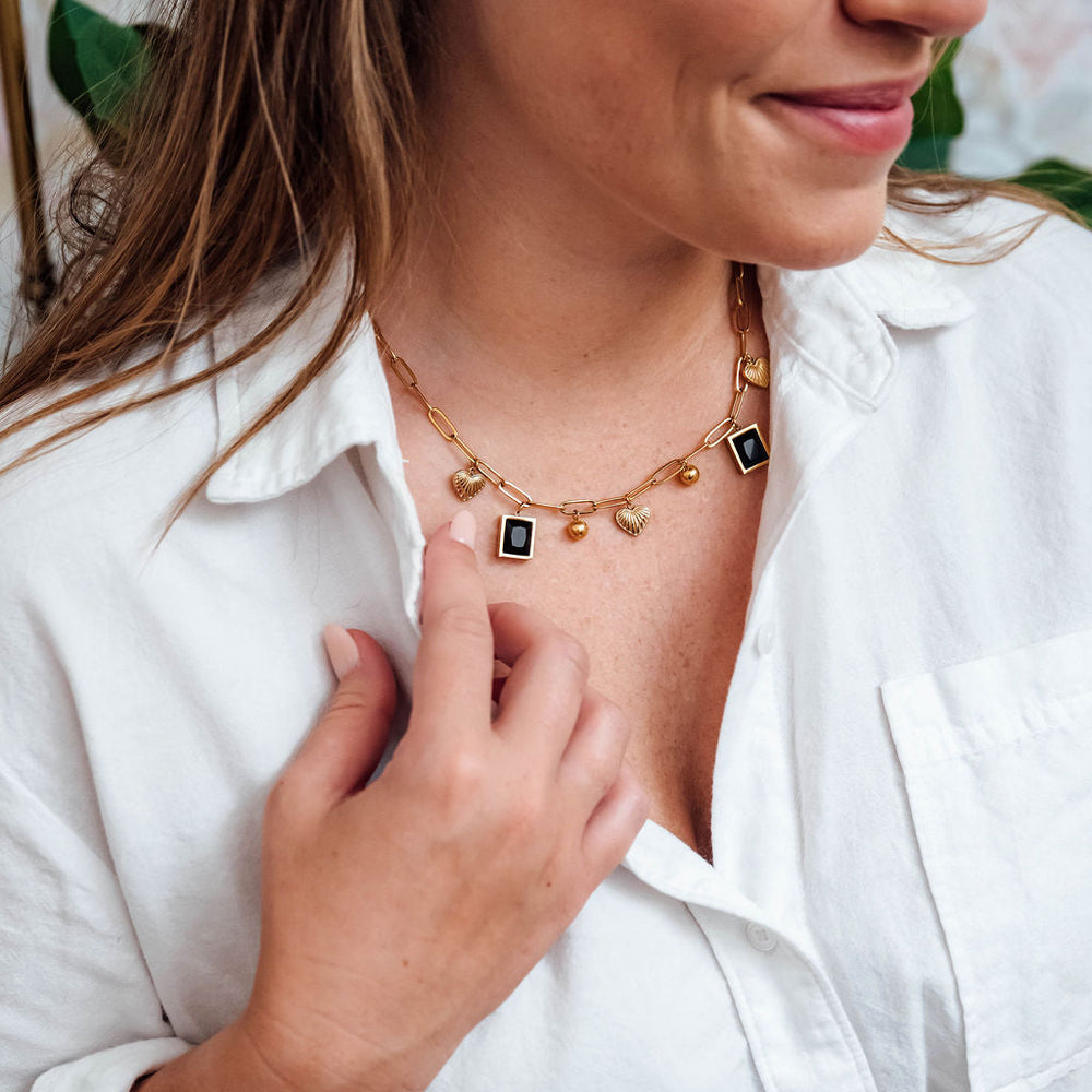 This one of a kind necklace is as charming as it gets! A gold plated stainless steel paper clip chain is adorned with gold hearts and black onyx stones.