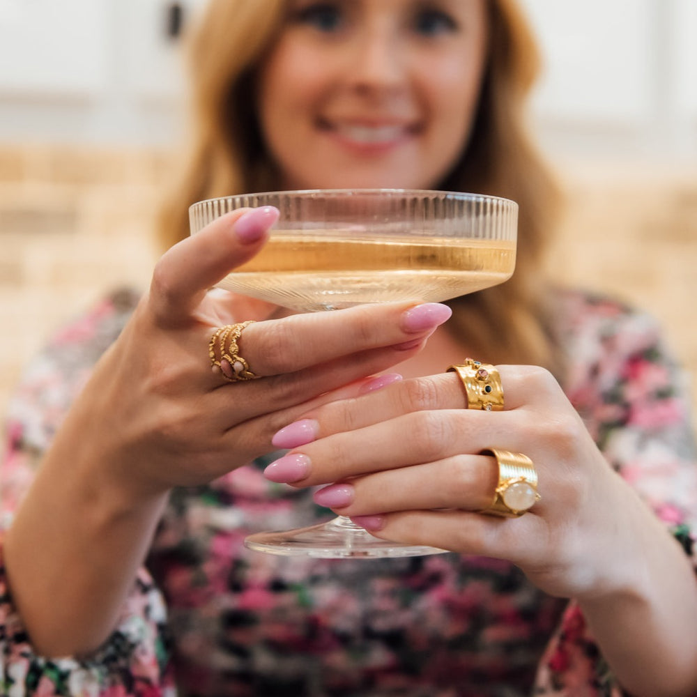 This adjustable ring, crafted from gold-plated stainless steel with a beautiful colored glass stones. Named after one of our stunning models, this ring carries a unique charm that resonates with style and sophistication.
