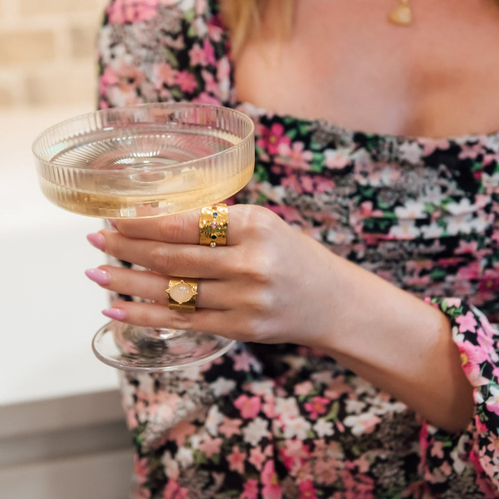 Made from gold plated stainless steel, this ring is fully adjustable and has a beautiful rose quartz stone design. Named in honor of Sarro Family member, a valued member of the Steward & James family, this ring is a token of our appreciation for her love and loyalty. Embrace the elegance and personal touch of the Sarro Ring, a symbol of gratitude and connection.